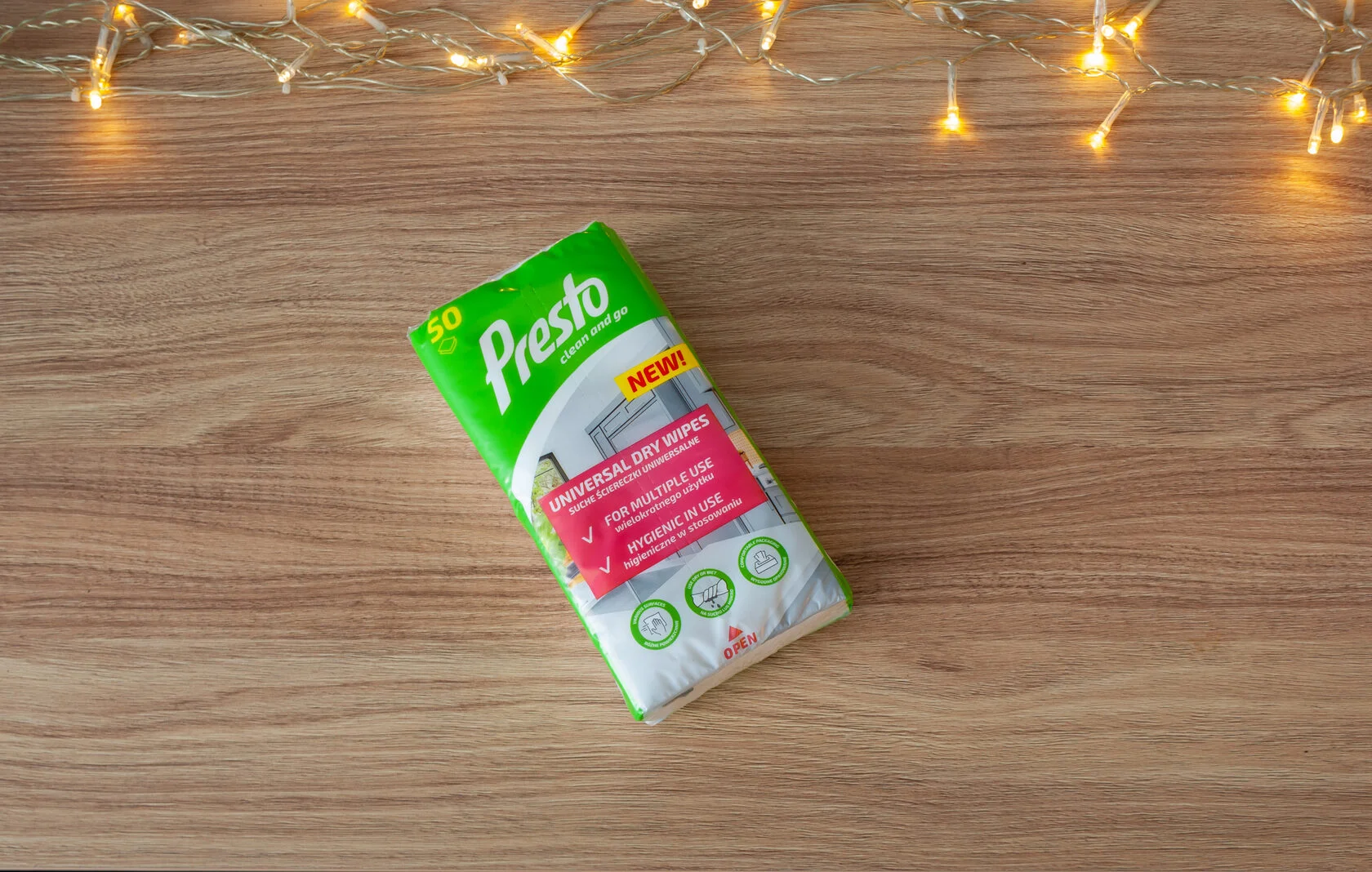 Produkty Presto pozwalają mieć więcej wolnego czasu dla Ciebie i Twojej rodziny. Ściereczki Presto to nowoczesne połączenie ściereczki z płynem czyszczącym w jednym produkcie. Dzięki Presto czyszczenie staje się łatwe i szybkie, ponieważ nie wymaga żadnych dodatkowych płynów, mleczek ani wiadra.